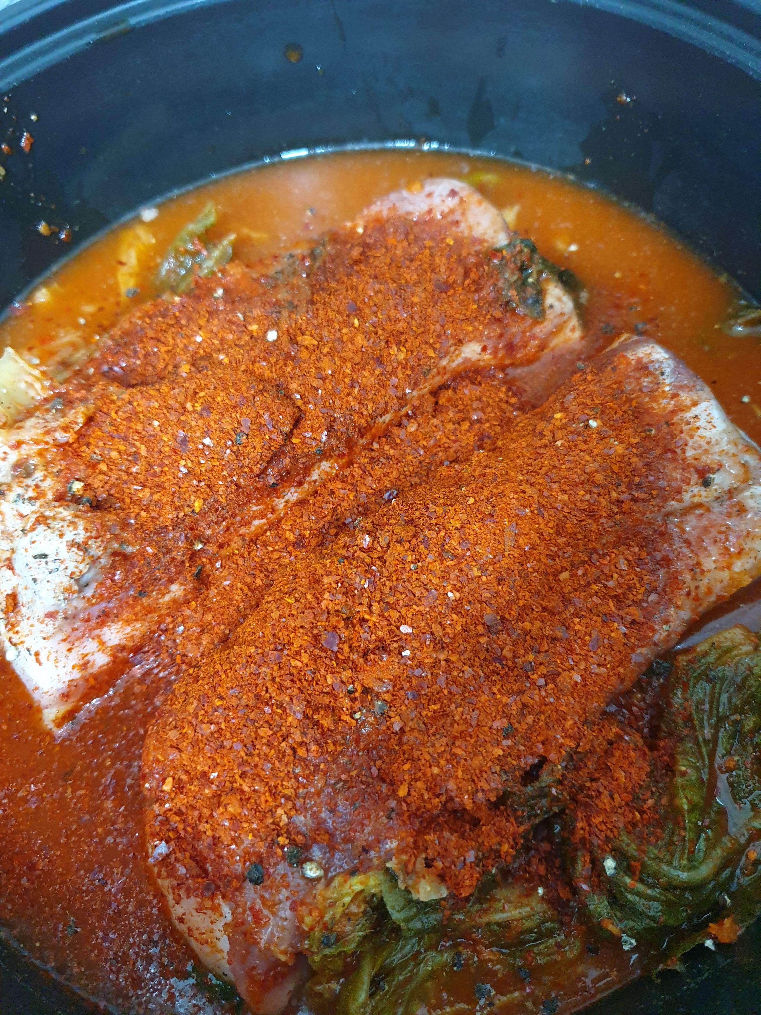 2. 통삼겹살 위에 김치 국물을 조금 부어줍니다.