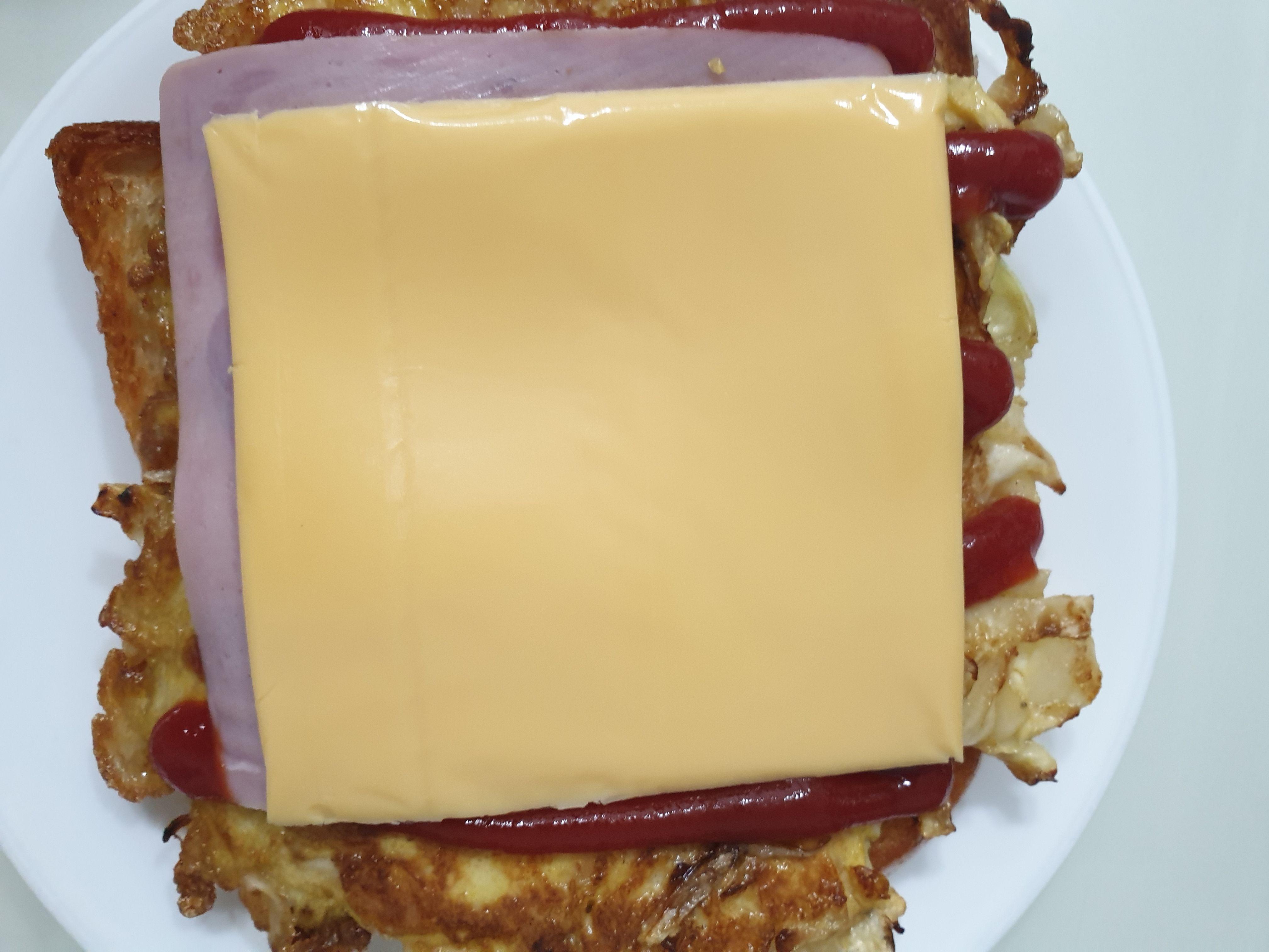 ⑦뿌려진 케첩 위에 슬라이스 햄과 치즈를 올려줍니다